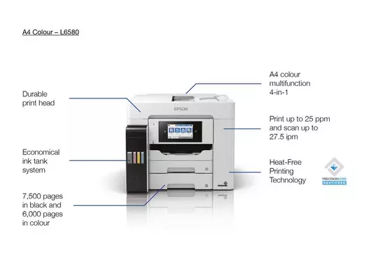 EcoTank L6580 A4 Multifunction Fast, time-saving printing A4 multifunction printer with fax, touchscreen and ADF Multiple connectivity options SKU: C11CJ28403SA